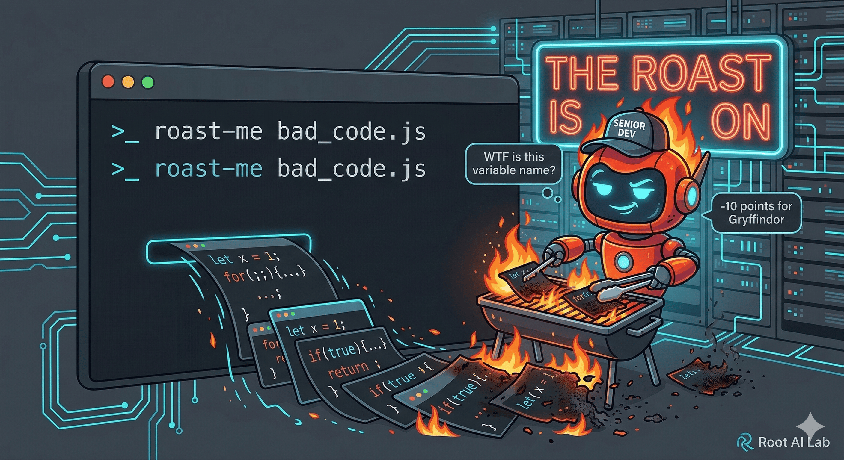 roast-me bad_code.jsThe Result: You now have a personalized, sarcastic AI mentor living in your terminal.
